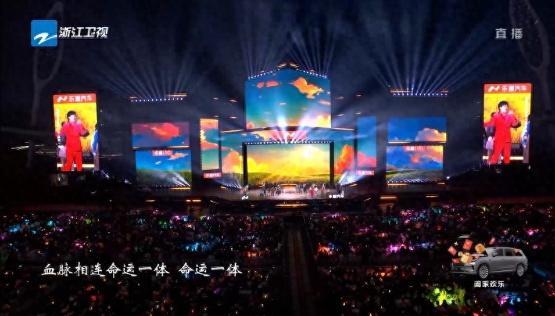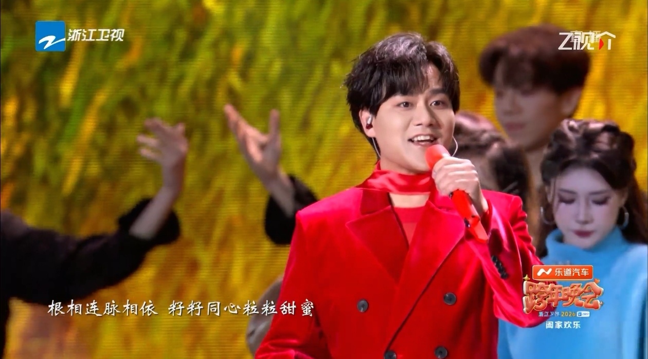 零点钟声敲响,浙江卫视跨年晚会舞台上,洛琦张开双臂,红色流光礼服在金色光芒中熠熠生辉,与全场三万观众齐声唱出“让我们相拥在一起”。