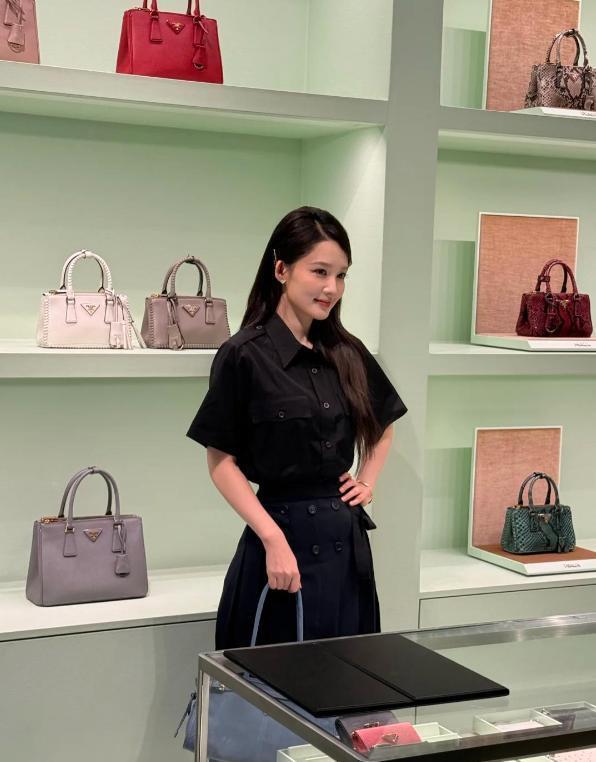 一进内场立刻换了画风,黑色衬衫搭拼接撞色褶皱半裙,黑长直发型衬得整个人气质清冷,活脱脱就是粉丝口中 “高智又时髦的 Prada 女郎”。