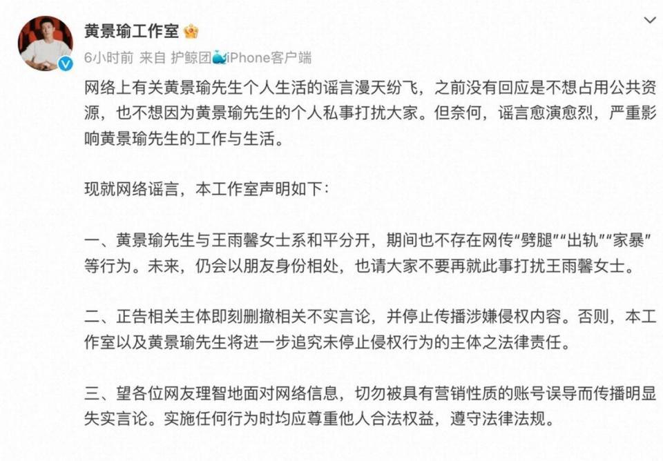 黄景瑜这边呢? 工作室发声明澄清,之后再也不吭声,一头扎进剧组,拍《破冰行动》、拍《罚罪》、拍《飞驰人生》,一年四季住在横店。