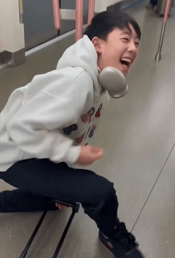 Jasper玩得太忘我,突然跟着行李箱一起摔到地上。