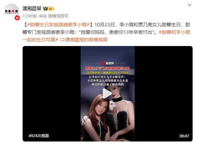 10月23日,李小璐和贾乃亮共同庆祝女儿甜馨生日,甜馨专门发视频感谢李小璐并配文“我爱你妈妈,谢谢你13年辛苦付出。”并再次在评论区为妈妈李小璐发声:“不管外界怎么引导,我都不会在意,我比你们还要了解我妈妈。”