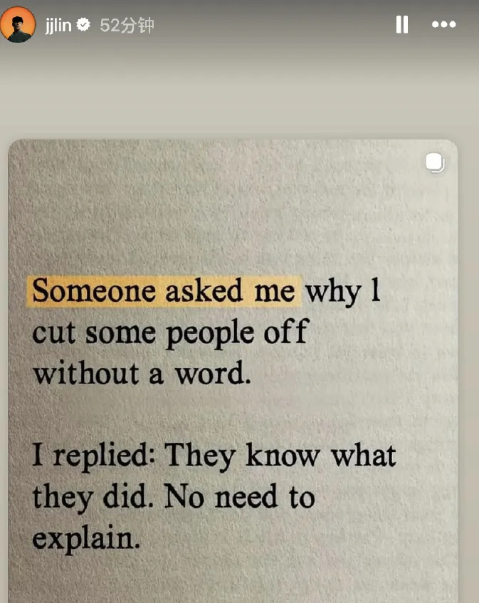 林俊杰与绯闻女友七七同框出街图曝光后,粉丝反应较为强烈。而后,林俊杰在社媒发了一段英文疑似回应恋情,大意是“没有解释的义务”,仍然逃避。