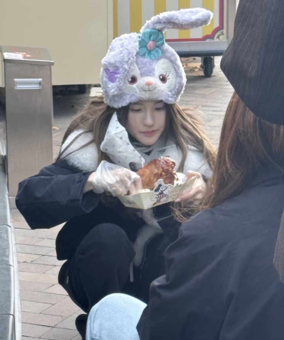 赵露思戴着星黛露的帽子,蹲在地上啃鸡腿的模样可爱至极。她摘下口罩后,面容变化明显,下巴更尖,鼻梁更挺,整体气质带有明显的韩系风格,宛如韩国女艺人一般。