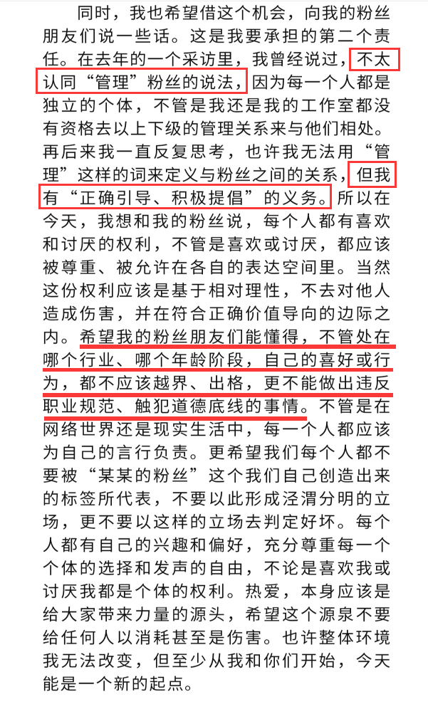 肖战谈及的第二点责任是此前提出的“不认同管理粉丝”,后来他明白“管理”这个词不够妥帖,但自己的确有“正确引导、积极提倡”的义务。