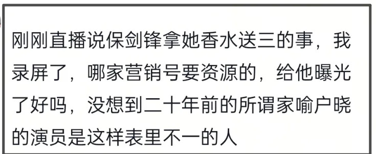 保剑锋遭遇第一波舆论声音时偷偷删评关评,从而导致舆论升级,迫不得已又强装镇定打开评论区,并更新日常。在偷香水故事传开后,保剑锋的评论区又被刷屏了,不少网友纷纷斥其表里不一,怒骂“他拿原配香水送小三”跌破眼镜。