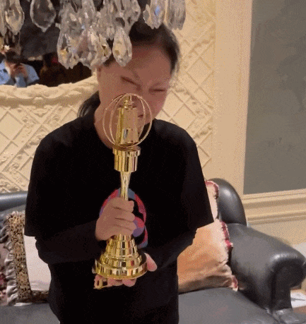看画面中的环境似乎是在S妈的家里,对面有助理在录像,S妈看到奖杯是非常开心的,但拿起来之后,就又哭又笑,直言“补上了我的心,谢谢宝贝。”