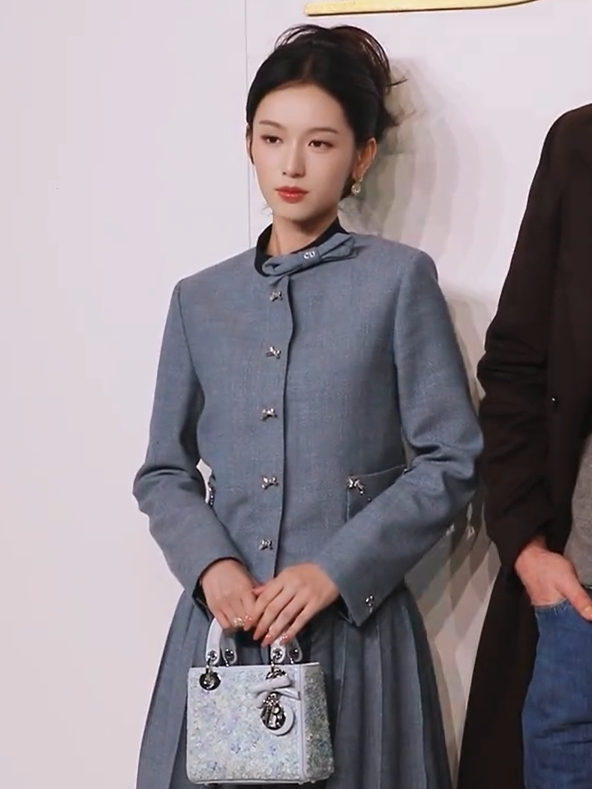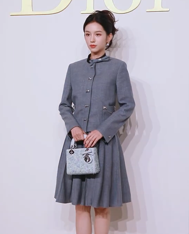 不得不说,这个风格跟周也还是很适配的,灰色学院风套装穿在她的身上,青春的感觉自然而然就出来了。
