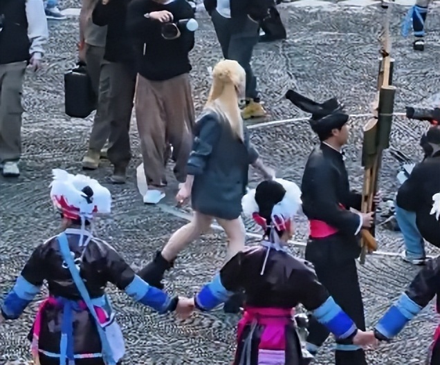 照片中她一头黄发坐在人群里特别显眼,穿了件灰色西装,下身光腿,脚上踩着厚底恨天高,可还是看着身材五五开,双腿又短又粗,跟路人没两样。